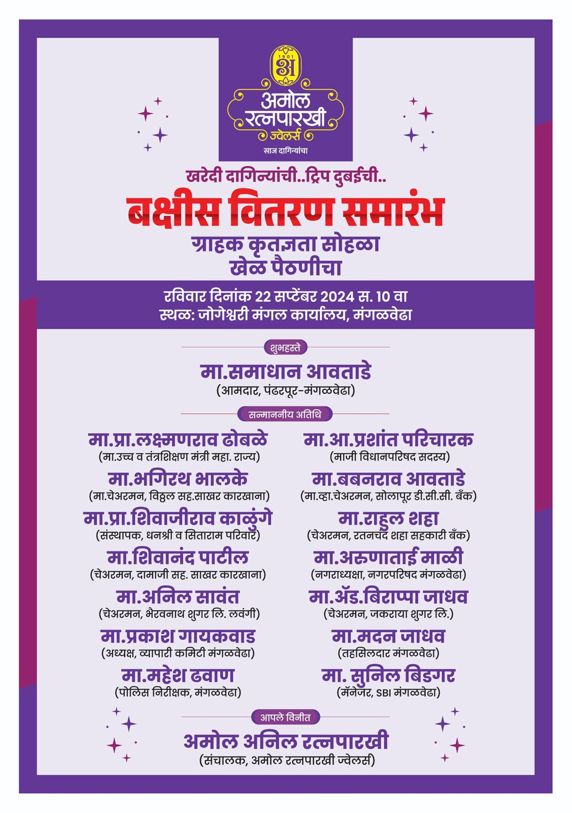 जोगेश्वरी मंगल कार्यालय मंगळवेढा येथे रविवार दिनांक 22 सप्टेंबर 2024 रोजी सकाळी 10 वाजता संपन्न होणाऱ्या ‘खरेदी दागिन्यांची ट्रिप दुबईची’ या योजनेचा बक्षीस वितरण समारंभ व ग्राहक कृतज्ञता सोहळा या कार्यक्रमासाठी ग्राहकांनी मोठ्या संख्येने उपस्थित रहावे असे आवाहन अमोल रत्नपारखी ज्वेलर्सच्या संचालिका सौ. अनुराधा अनिल रत्नपारखी यांनी केले आहे. कार्यक्रमाच्या यशस्वीतेसाठी शिवप्रिया रत्नपारखी, साक्षी रत्नपारखी, चैतन्य रत्नपारखी यांचेसह अमोल रत्नपारखी ज्वेलर्सचा सर्व स्टाफ व अमोल रत्नपारखी मित्रपरिवार परिश्रम घेत आहे.