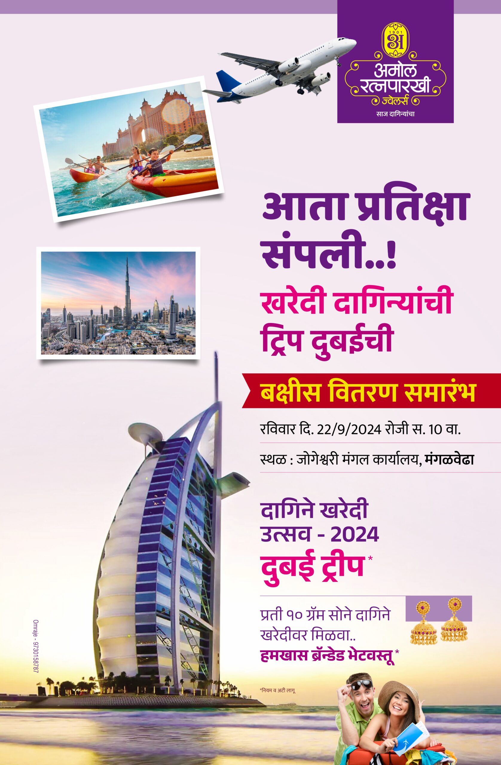 मंगळवेढा शहरालगत असलेल्या जोगेश्वरी मंगल कार्यालय येथे हा कार्यक्रम रविवार दिनांक 22 सप्टेंबर 2024 रोजी सकाळी 10 वाजता संपन्न होणार आहे. अमोल रत्नपारखी ज्वेलर्सच्या वतीने ग्राहकांसाठी ‘खरेदी दागिन्यांची ट्रीप दुबईची’ हि योजना राबविण्यात आली होती. या योजनेस ग्राहकांचा अतिशय चांगला प्रतिसाद मिळाला आहे.