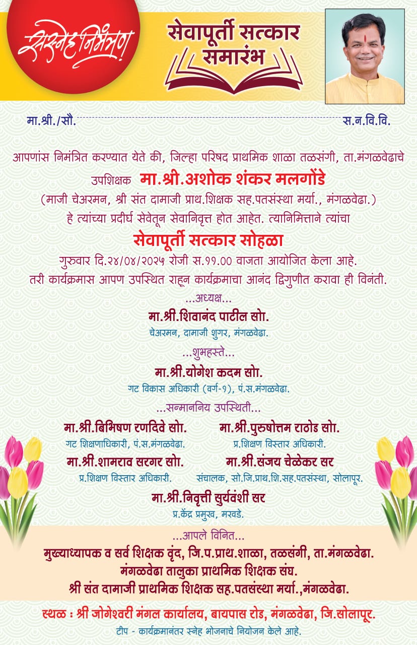 गुरुवार दिनांक 24 एप्रिल 2025 रोजी सकाळी 11 वाजता जोगेश्वरी मंगल कार्यालय बायपास रोड मंगळवेढा येथे अशोक मलगोंडे यांच्या होणाऱ्या सेवापूर्ती सत्कार समारंभास शैक्षणिक क्षेत्रातील मान्यवरांनी मोठ्या संख्येने उपस्थित राहावे असे आवाहन सौ. लता मलगोंडे, अनुजा मलगोंडे व अक्षय मलगोंडे यांनी केले आहे.