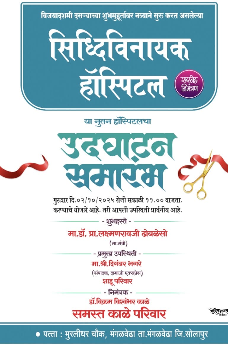 दसऱ्याच्या शुभ मुहूर्तावर गुरुवार दिनांक 2 ऑक्टोंबर 2025 रोजी सकाळी 11 वाजता सिद्धिविनायक हॉस्पिटलचे उद्घाटन राज्याचे माजी उच्च व तंत्र शिक्षण मंत्री तथा राष्ट्रवादी काँग्रेस पार्टी शरदचंद्र पवार पक्षाचे प्रदेश उपाध्यक्ष प्रा. डॉ. लक्ष्मणराव ढोबळे यांच्या शुभहस्ते होणार आहे. या कार्यक्रमासाठी प्रमुख पाहुणे म्हणून ज्येष्ठ पत्रकार तथा दैनिक दामाजी एक्सप्रेसचे संपादक दिगंबर भगरे व शाहू परिवारातील सन्माननीय सदस्य उपस्थित राहणार आहेत.